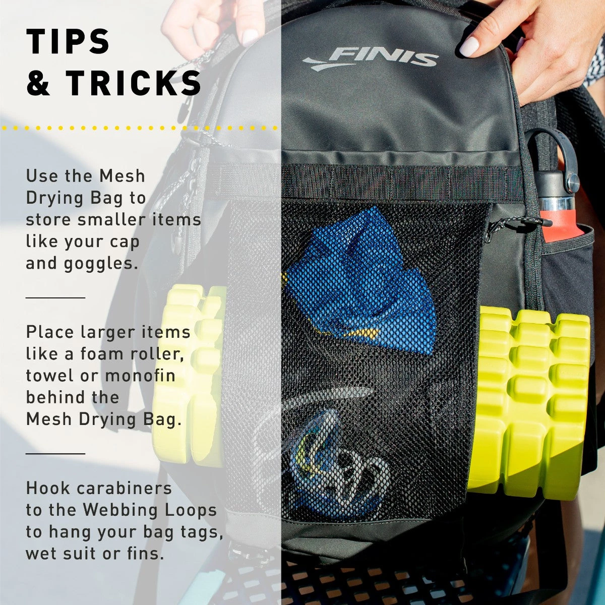 - Lift up the mesh drying bag to secure larger items like a foam roller, towel, or monofin without the bulk