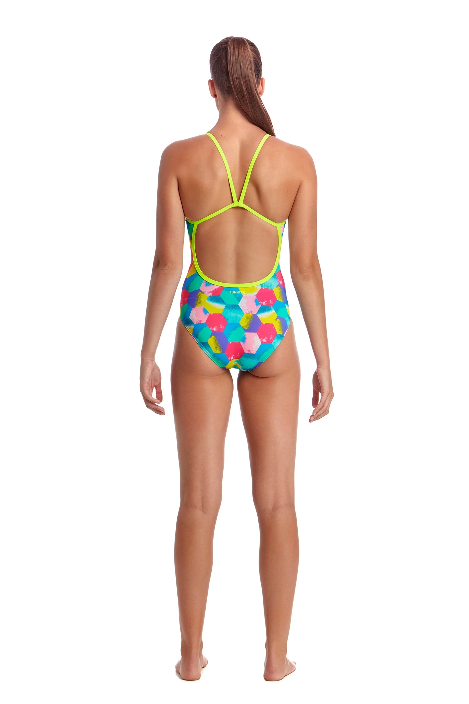 Single strap one piece with strappy V shaped back. Excellent durability and freedom of movement with single bind finish and an open back that will flatter your sporty shape. With full front lining, this is the perfect style for those long hours of training in the pool.