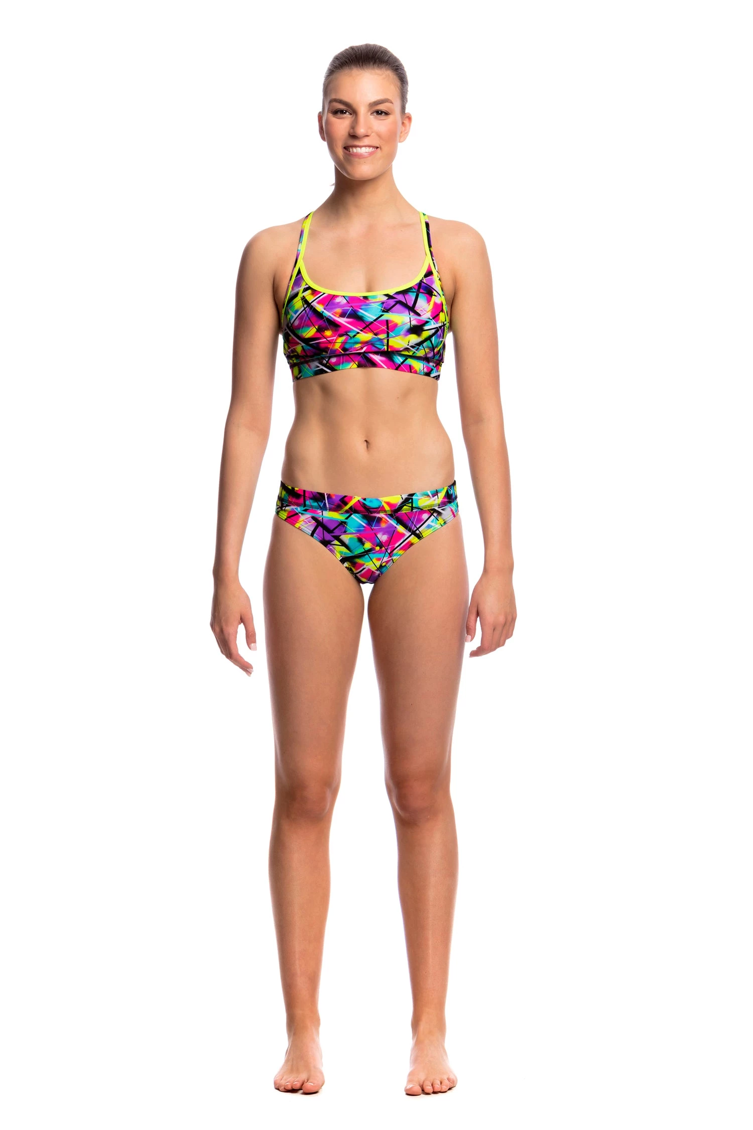 Firm fitting sports crop top with racer back and double strap bind finish with wide elastic for under bust support to give you the support you need in a sports top. Sold as separates and available in sizes 8 – 14.