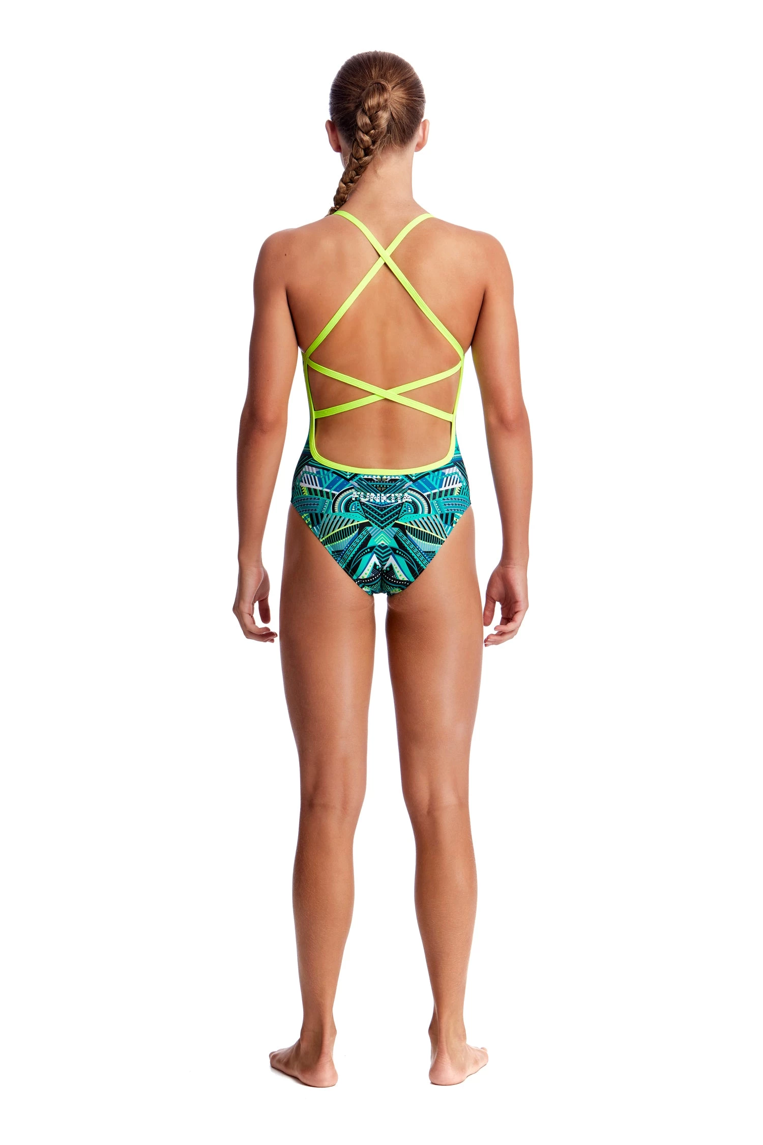 You’ll be sure to get noticed on pool deck in our strappiest one piece yet! Single strap binds that criss cross down your back with a moderately high cut leg.