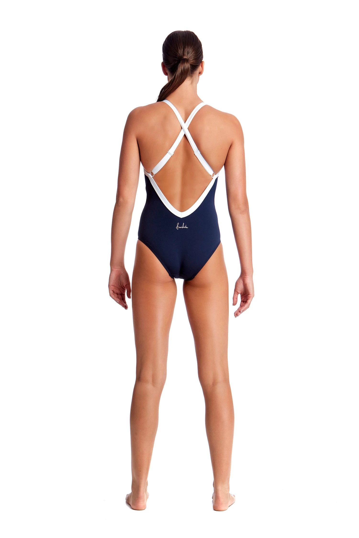 This streamlined suit features wide straps, a high neck and teardrop shaped back cut out. With adjustable straps and modest rear coverage it is perfect for lap sessions or lazy sessions by the pool. Suitable up to D cup.