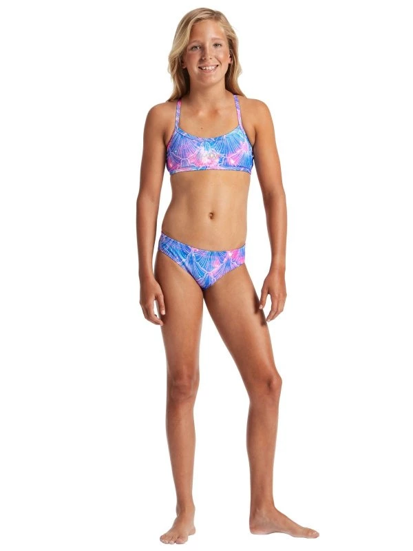 The sparkling AMANZI Mermaid Kisses Sports Bikini features a gorgeous cerulean print with sparkling galaxies in pretty pastel pink, emerald, amethyst, and topaz. With a magnolia white seashell pattern over the top, this one piece is easily one of the prettiest prints of the season.