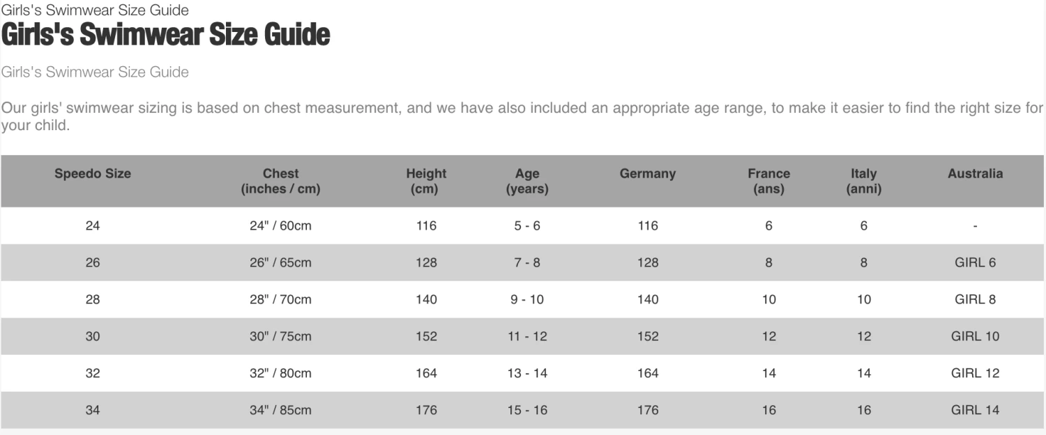 Our girls’ swimwear sizing is based on chest measurement, and we have also included an appropriate age range, to make it easier to find the right size for your child.