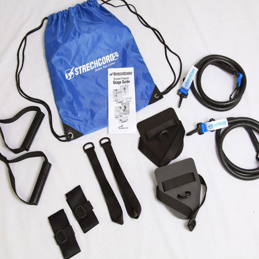The STRECHCORDZ® MODULAR SET is an exercise machine in a bag. The Modular set is a complete wet or dry-land swim training tool that can be used for pulls, rows, raises, curls, flies – nearly any resistance exercise you can imagine.